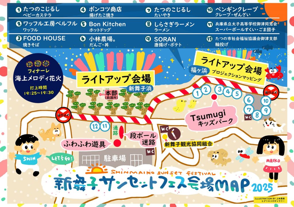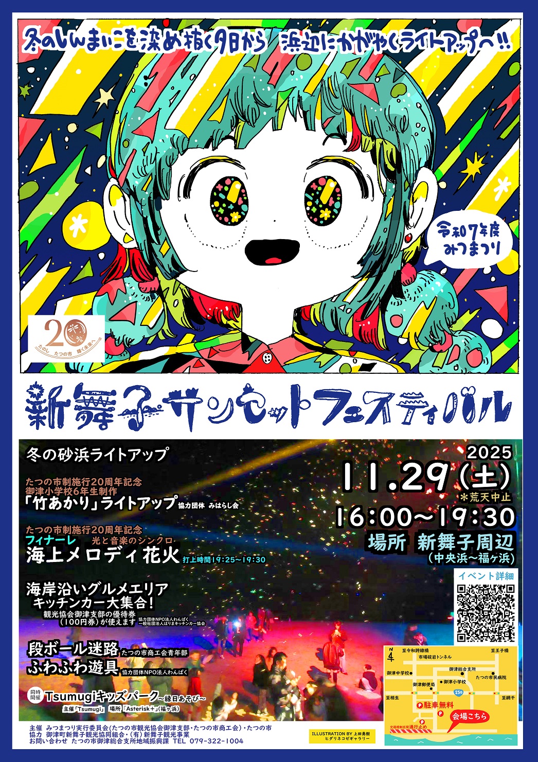みつまつり 新舞子サンセットフェスティバル2025を開催 夕暮れの景色が美しい新舞子の砂浜を、幻想的なライトアップで彩ります。また、市制施行20周年を記念して、花火と光、音楽を融合させた海上メロディ花火を打ち上げ、御津小学校6年生が製作した竹あかりを灯します。 開催日時11月29日(土曜日)16時~19時30分開催場所新舞子周辺 中央浜~福ヶ浜イベント内容■市制施行20周年記念御津小学校6年生が製作「竹あかり」ライトアップ時間:日没~19時30分■砂浜ライトアップ時間:日没~19時30分区間:中央浜~海岸沿い~福ヶ浜 全長500m■市制施行20周年記念「海上メロディ花火」時間:19時25分~19時30分(約5分間)■海岸沿いグルメエリア(キッチンカー)、模擬店時間:16時~19時30分焼きそば、揚げたこ焼き、ホットドッグ、だんご、ラーメン、ポテト、クレープ、スーパーボールすくい、輪投げ など※飲食用テーブルを設けています。※観光協会御津支部の優待券(100円券)が使えます。■段ボール迷路(有料)時間:16時~19時30分対象:小学生以下■ふわふわ遊具(有料)時間:16時~19時30分対象:小学生以下【同時開催】tsumugiキッズパーク時間:16時~19時場所:Asterisk+(福ヶ浜沿い)主催:Tsumugi内容:室内での縁日あそび、ビンゴゲーム詳細は「Tsumugi」のインスタグラムをご覧ください。駐車場新舞子周辺駐車場1,000台(無料)をご利用ください。その他天候等によりイベント内容を変更・中止する場合があります。水難事故防止のため、夜の海には絶対に入らないでください。お問い合わせみつまつり実行委員会(TEL:079-322-1004) みつまつり 新舞子サンセットフェスティバル2025を開催