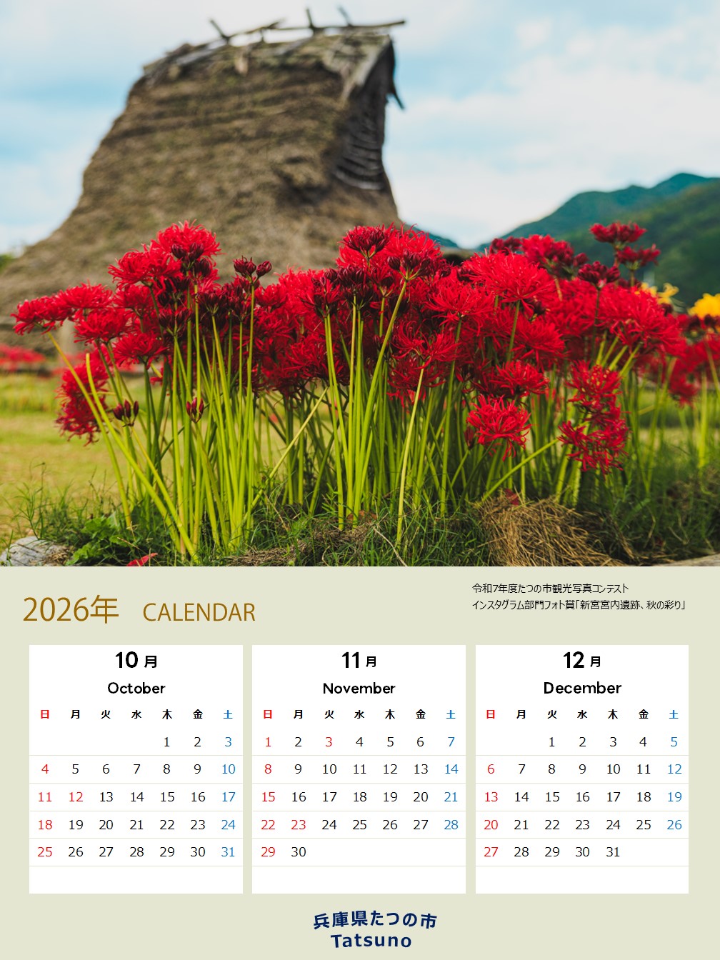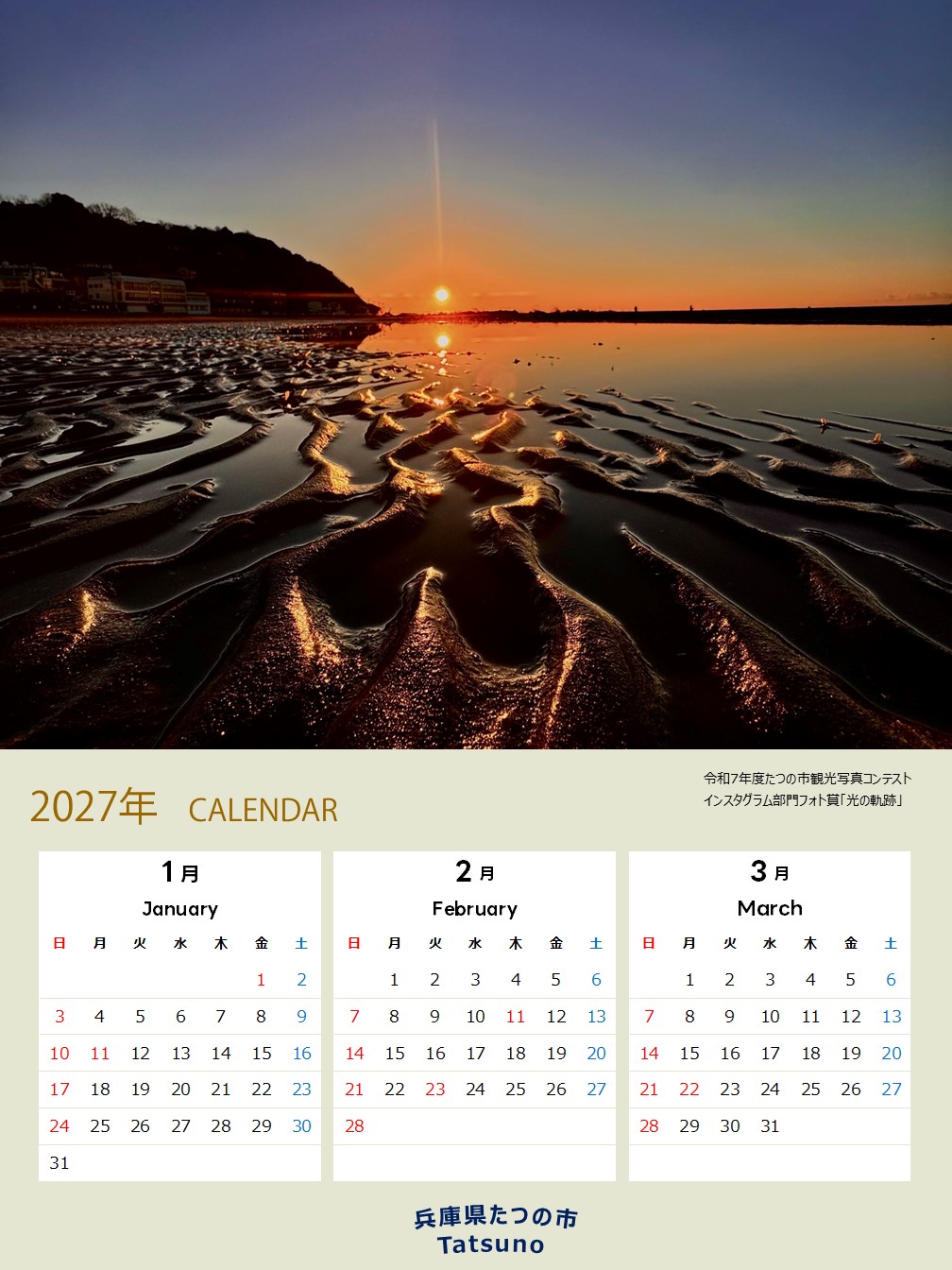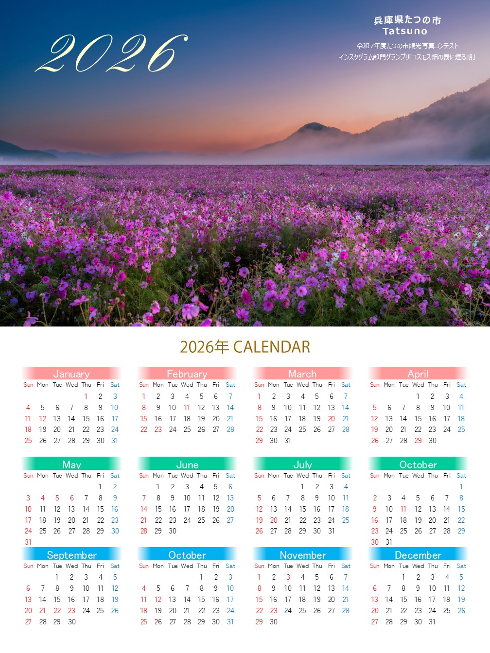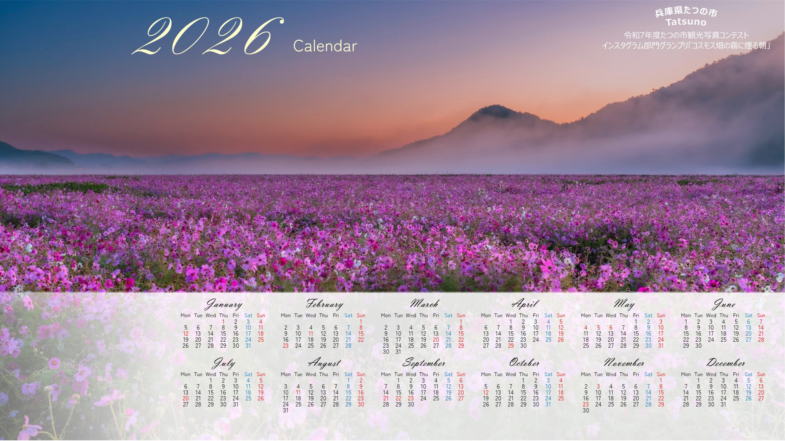 観光カレンダー&PC用デスクトップ壁紙の無料ダウンロード 令和7年度たつの市観光写真コンテストインスタグラム部門の入賞作品5点(グランプリ1点・フォト賞4点)を観光カレンダーとPC用デスクトップ壁紙にしました。ダウンロードしてご活用ください。 1 カレンダー 2026年間カレンダー 令和7年度たつの市観光写真コンテストインスタグラム部門グランプリ「コスモス畑の霧に煙る朝」【JPEG】【PDF】 2026年度カレンダー 令和7年度たつの市観光写真コンテストインスタグラム部門フォト賞「梅香る梅園」【JPEG】【PDF】 令和7年度たつの市観光写真コンテストインスタグラム部門フォト賞「滝の上を通過する姫新線」【JPEG】【PDF】 令和7年度たつの市観光写真コンテストインスタグラム部門フォト賞「新宮宮内遺跡、秋の彩り」【JPEG】【PDF】 令和7年度たつの市観光写真コンテストインスタグラム部門フォト賞「光の軌跡」【JPEG】【PDF】 2 PC用デスクトップ壁紙 2026年間カレンダー 令和7年度たつの市観光写真コンテストインスタグラム部門グランプリ「コスモス畑の霧に煙る朝」日曜始まり【JPEG】月曜始まり【JPEG】 2026年度カレンダー 令和7年度たつの市観光写真コンテストインスタグラム部門フォト賞「梅香る梅園」【JPEG】 令和7年度たつの市観光写真コンテストインスタグラム部門フォト賞「滝の上を通過する姫新線」【JPEG】 令和7年度たつの市観光写真コンテストインスタグラム部門フォト賞「新宮宮内遺跡、秋の彩り」【JPEG】 令和7年度たつの市観光写真コンテストインスタグラム部門フォト賞「光の軌跡」【JPEG】