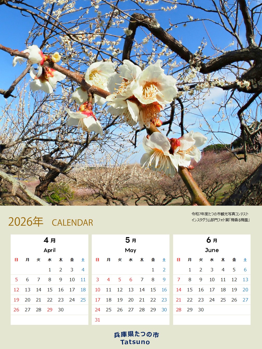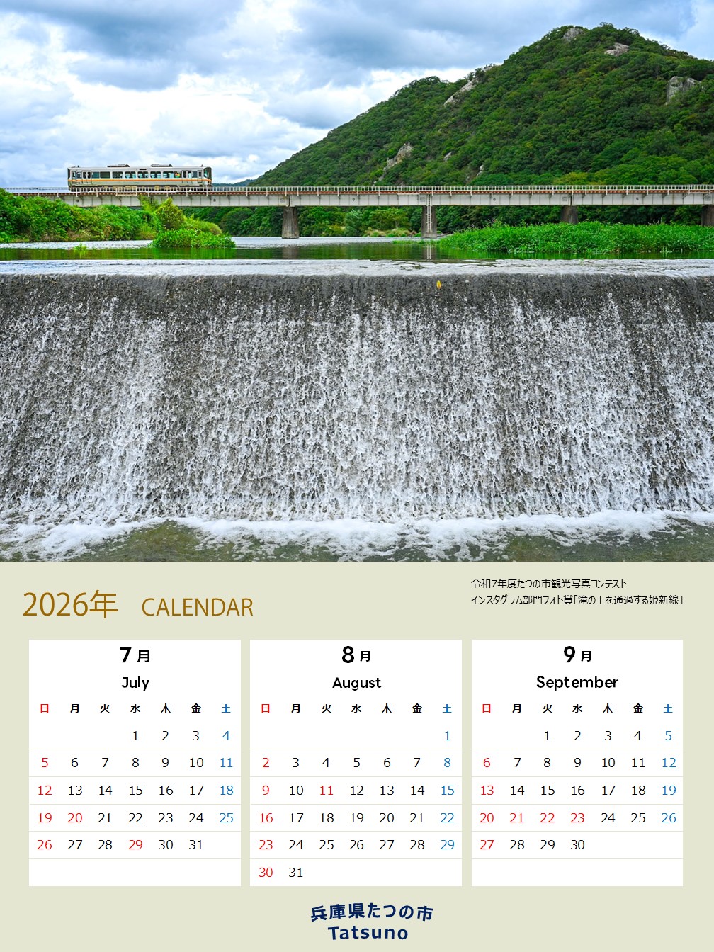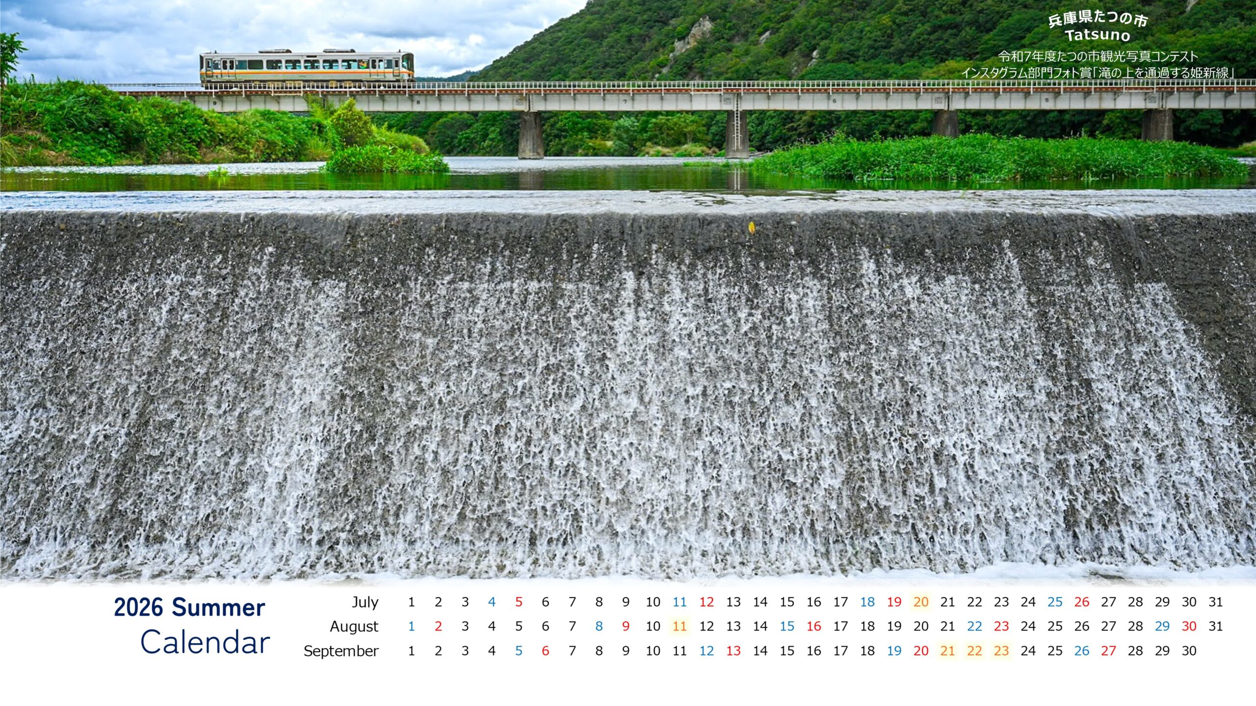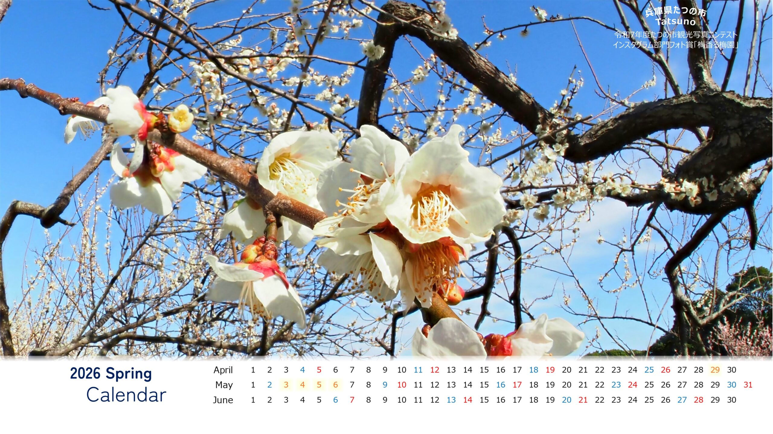 観光カレンダー&PC用デスクトップ壁紙の無料ダウンロード 令和7年度たつの市観光写真コンテストインスタグラム部門の入賞作品5点(グランプリ1点・フォト賞4点)を観光カレンダーとPC用デスクトップ壁紙にしました。ダウンロードしてご活用ください。 1 カレンダー 2026年間カレンダー 令和7年度たつの市観光写真コンテストインスタグラム部門グランプリ「コスモス畑の霧に煙る朝」【JPEG】【PDF】 2026年度カレンダー 令和7年度たつの市観光写真コンテストインスタグラム部門フォト賞「梅香る梅園」【JPEG】【PDF】 令和7年度たつの市観光写真コンテストインスタグラム部門フォト賞「滝の上を通過する姫新線」【JPEG】【PDF】 令和7年度たつの市観光写真コンテストインスタグラム部門フォト賞「新宮宮内遺跡、秋の彩り」【JPEG】【PDF】 令和7年度たつの市観光写真コンテストインスタグラム部門フォト賞「光の軌跡」【JPEG】【PDF】 2 PC用デスクトップ壁紙 2026年間カレンダー 令和7年度たつの市観光写真コンテストインスタグラム部門グランプリ「コスモス畑の霧に煙る朝」日曜始まり【JPEG】月曜始まり【JPEG】 2026年度カレンダー 令和7年度たつの市観光写真コンテストインスタグラム部門フォト賞「梅香る梅園」【JPEG】 令和7年度たつの市観光写真コンテストインスタグラム部門フォト賞「滝の上を通過する姫新線」【JPEG】 令和7年度たつの市観光写真コンテストインスタグラム部門フォト賞「新宮宮内遺跡、秋の彩り」【JPEG】 令和7年度たつの市観光写真コンテストインスタグラム部門フォト賞「光の軌跡」【JPEG】