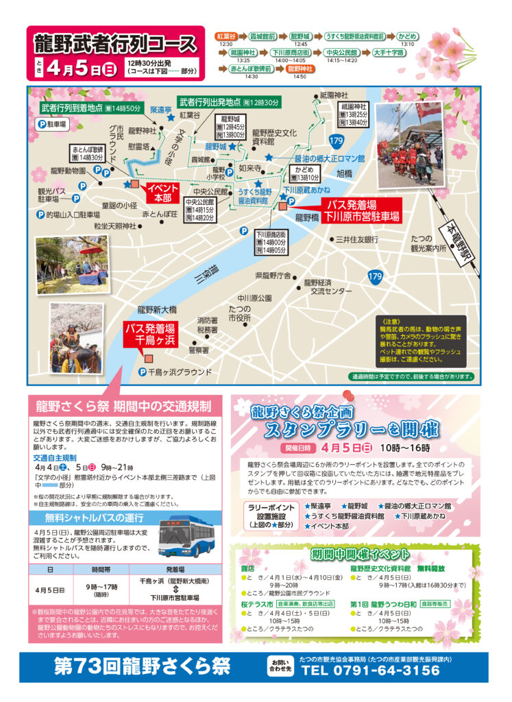 龍野さくら祭期間中の4月4日(土曜日)・4月5日(日曜日)に、龍野公園周辺で交通自主規制を行います。また、龍野武者行列が行われる4月5日(日曜日)は、安全確保のため規制路線以外でも迂回をお願いすることがあります。