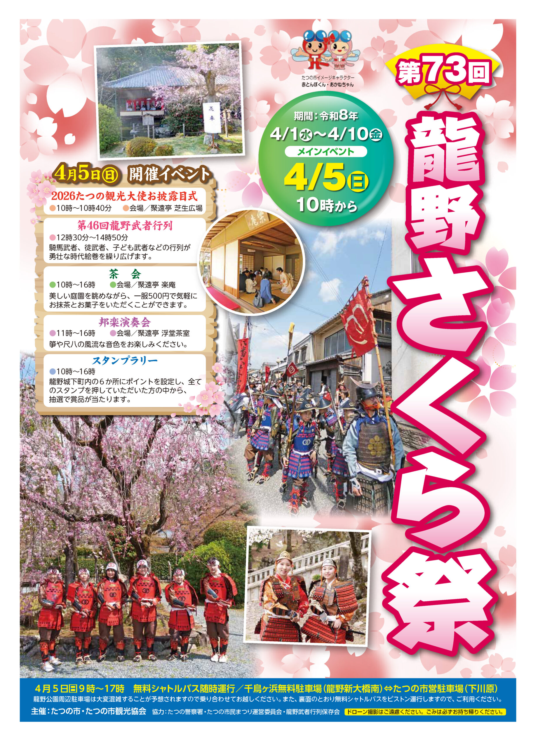 東山公園もみじまつり2021 令和3年11月3日(水曜日・祝日)~11月23日(月曜日・祝日) 新宮地区「東山公園」の11月は、日増しに移り行くモミジなど色鮮やかな紅葉で彩られます。期間中毎晩ライトアップを行います。園内は幻想的な雰囲気に包まれ、一面の紅葉を楽しむことができます。隣接する志んぐ荘では期間中、ランチバイキングも企画していますので、ご家族やご友人等で、ぜひお越しください。 東山公園もみじまつり2021 開催概要 開催日時令和3年11月3日(水曜日・祝日)~11月23日(火曜日・祝日)開催場所東山公園(たつの市新宮町新宮 国民宿舎志んぐ荘隣) 新宮地区「東山公園」の11月は、日増しに移り行くモミジなど色鮮やかな紅葉で彩られます。期間中毎晩ライトアップを行います。園内は幻想的な雰囲気に包まれ、一面の紅葉を楽しむことができます。 東山公園もみじまつりチラシ(PDF:1,738KB) PDF形式のファイルをご覧いただく場合には、Adobe Acrobat Readerが必要です。Adobe Acrobat Readerをお持ちでない方は、バナーのリンク先から無料ダウンロードしてください。 イベント内容 ※新型コロナウイルス感染状況により、イベント内容が変更となる場合があります。 ライトアップ 期間中(11月3日~11月23日)毎日17時30分~20時 ライブイベント ■ 11月7日(日曜日) 13時~:メガトーンジャズオーケストラ 秋のJAZZ LIVEをお楽しみください ■ 11月14日(日曜日) 13時~:ナイトファーブル アニメソング&80年代Jポップス 14時~:トリオ白川 JAZZを聴きながら心を癒しませんか ランチバイキング 国民宿舎志んぐ荘 期間:期間中(11月3日~11月23日)毎日11時30分~14時30分(最終受付 13時30分) 写真コンテスト 応募期間:11月3日(水曜日・祝日)~11月23日(火曜日・祝日) 応募方法:下記の事項をお読みいただき、パソコン・スマートフォンから応募フォームにて応募してください。 応募フォーム(info@shinguso.com)に必要事項(住所・撮影者氏名・電話番号・メールアドレス・応募写真の撮影日)を入力し、応募してください。 応募はおひとり様2点までとさせていただきます。 応募される方は、応募作品の著作権は志んぐ荘に帰属することに同意したうえで、データをご提出ください。 ご記入いただいた個人情報は本コンテストの実施目的以外に使用いたしません。ただし、入賞・入選者の個人名と住所の一部(都道府県市町村)は発表の際に公表いたします。 主催 国民宿舎 志んぐ荘 後援 たつの市観光協会新宮支部 地図 お問合せ 所属課室:国民宿舎 志んぐ荘 住所:兵庫県たつの市新宮町新宮1093 電話番号:0791-75-0401 イベント一覧 いぼがわ水辺フェスティバルを初開催 「たつの市民まつり」を盛り上げていただく、たつのとっておきストリート、PRブース、屋台村、フリーマーケットの出店者およびパレード参加者を募集します。 『醤油特集』を特集ページに追加 「たつの」にちなんだ名物メニューが 人気のレトロなカフェ 『男はつらいよ 寅次郎夕焼け小焼け』ロケ地ページを公開しました 男はつらいよ第17作のロケ地たつの市は 映画に登場する場所や空気感が今も変わらず残っている。 『末廣醤油』をお土産ページに追加 「たつの」にちなんだ名物メニューが 人気のレトロなカフェ 『大阪屋AO』を宿泊ページに追加 「たつの」にちなんだ名物メニューが 人気のレトロなカフェ 『エデンの東』をグルメページに追加 「たつの」にちなんだ名物メニューが 人気のレトロなカフェ 『お菓子のわらいや』をお土産ページに追加 「楽しいお菓子の夢の国」わらいや 「第73回龍野さくら祭」を開催 市内の農産品の生産者、地元団体や企業等の協力による「下川原ふるさと朝市」を開催します。 「新宮納涼ふれあいまつり&花火大会」を開催 市制施行20周年にちなん だ「20」の数字花火など約1,000発を打ち上げ、夏の夜空を華やかに彩 ります。 123456789101112131415161718