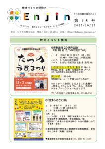たつの市観光協会が実施するイベントや活動内容を広く知っていただくため、会報誌を発行することとなりました。タイトルは、地域づくりの原動力となる「Engine(エンジン)」と4つの支部が力を合わせ「円陣」を組んで取り組んでいく意味合いを込めて「Enjin」と名付けました。